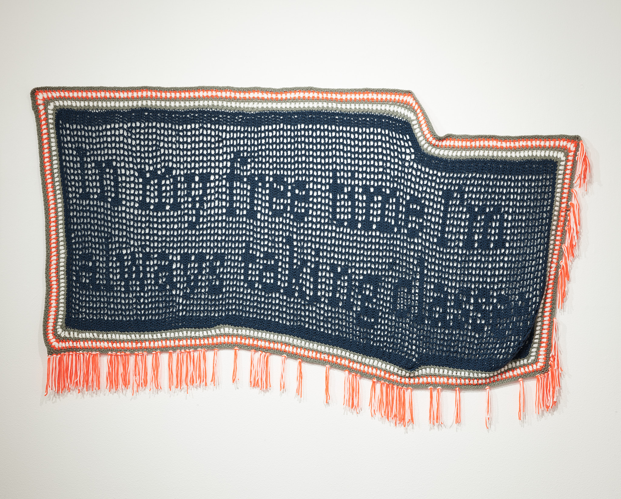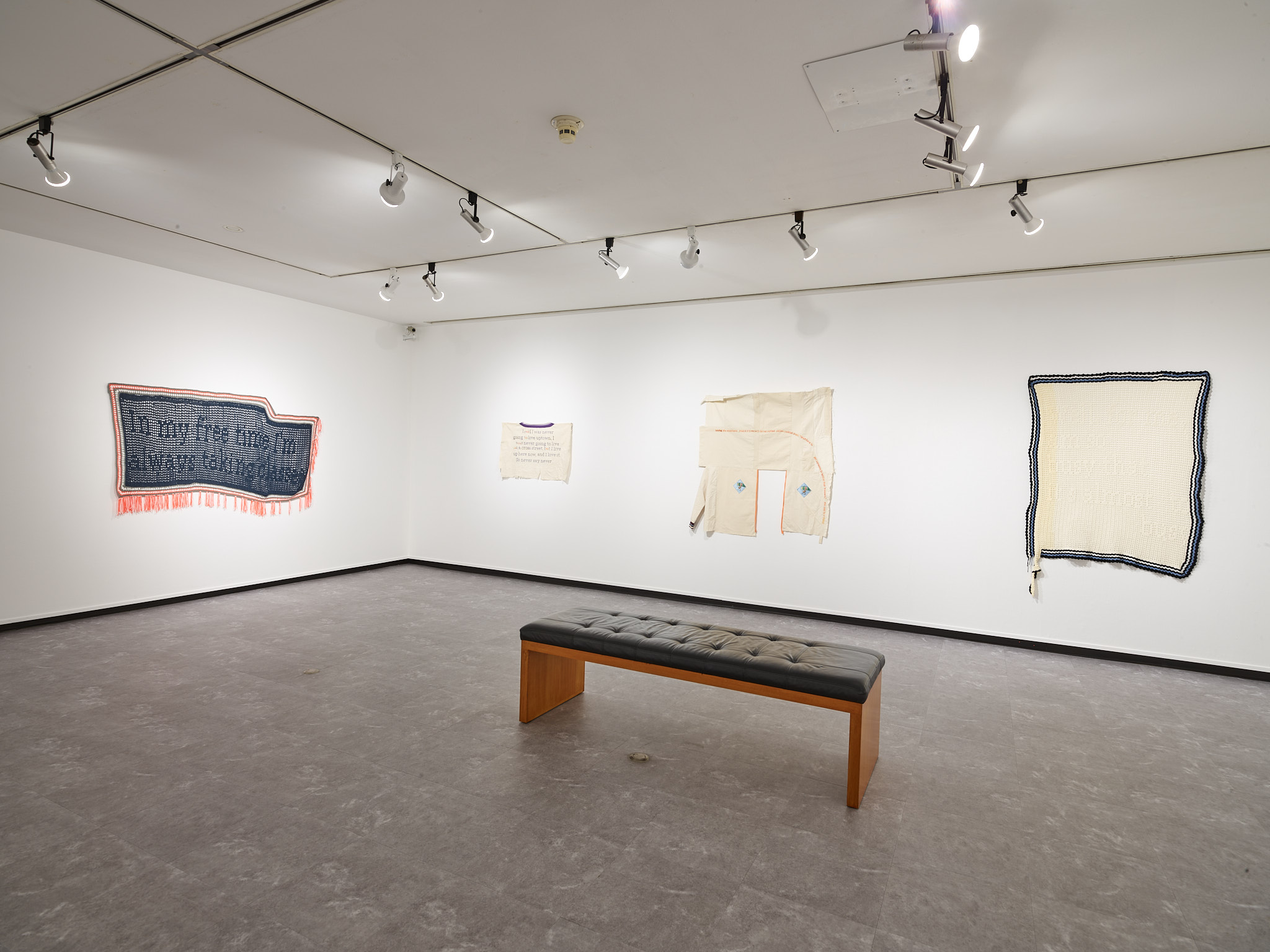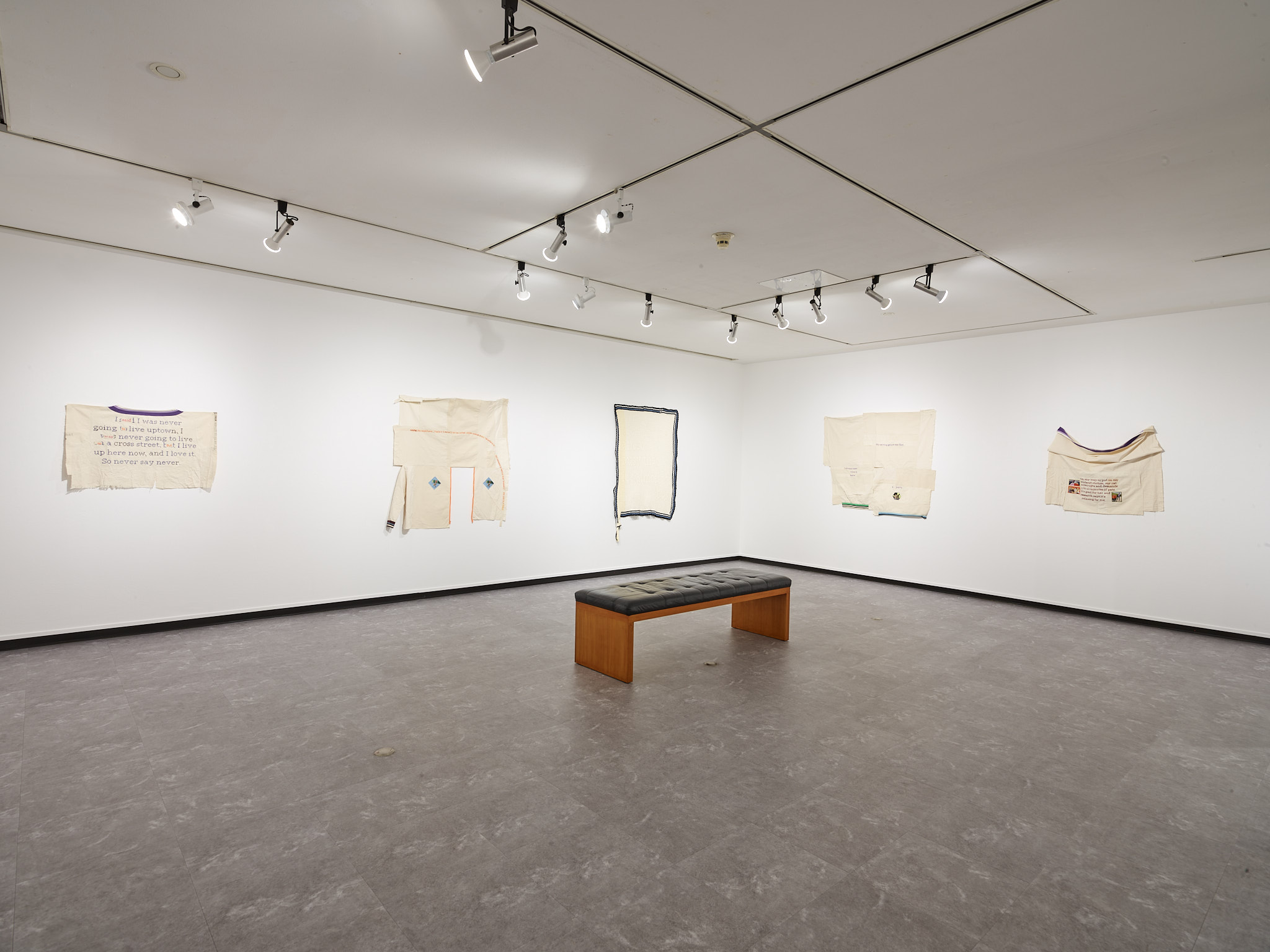 Hand-me-downs is a solo exhibition satirizing the normalization of the narcissistic narrative. By definition, hand-me-downs are “things, especially clothes, which have been used by someone else before you and have been given to you for your use.” As the title suggests, I am interested in the possibility that the found text embroidered on the works in this show, can be read as wisdom and/or advice, given to you for your use, especially as it relates to self-expression in pursuit of social currency.