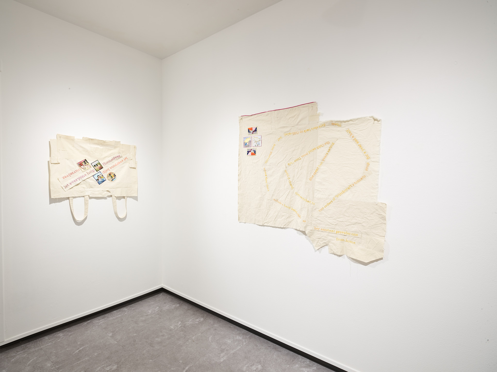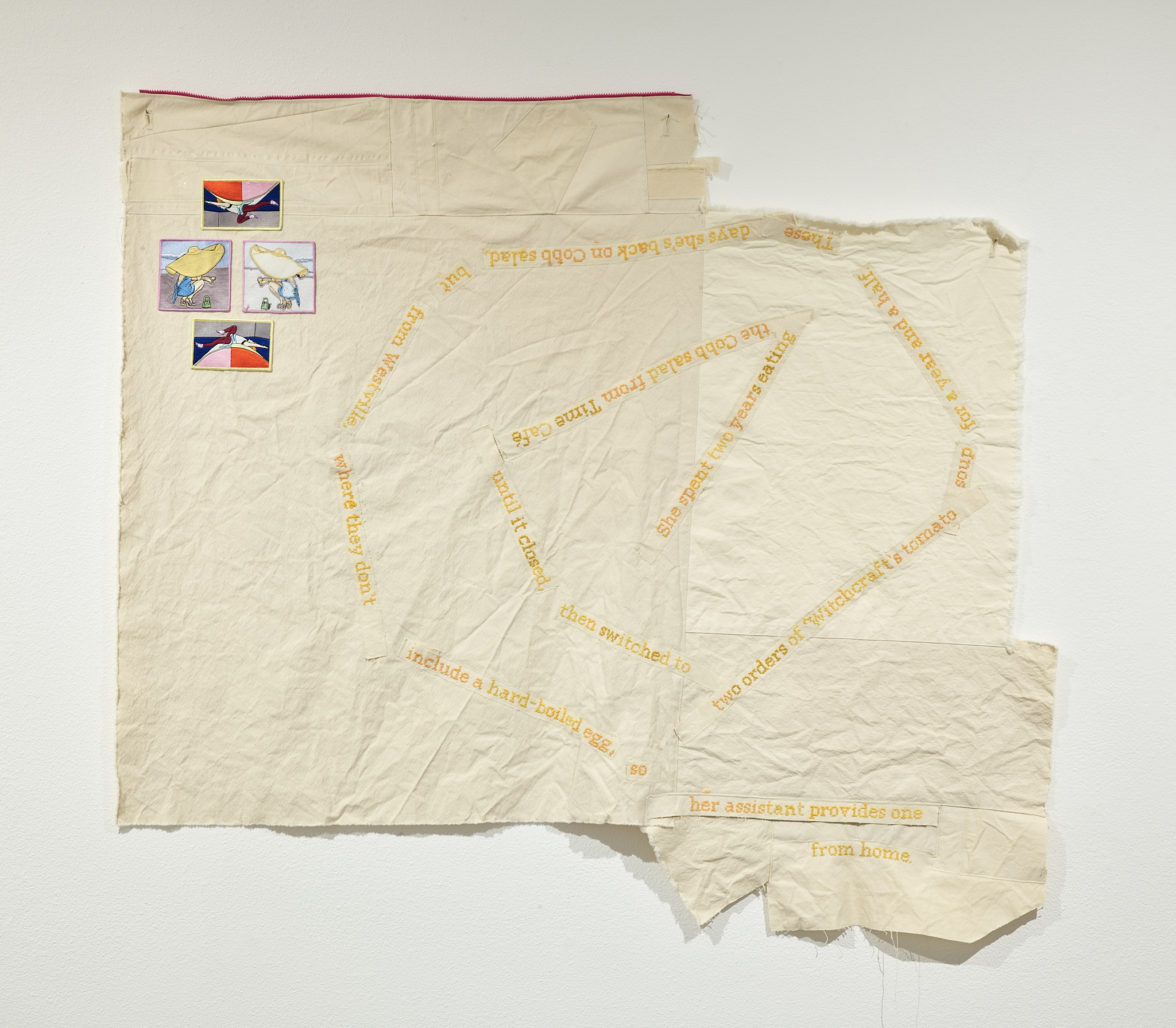 As an artist, my work draws parallels between handiwork and social media. I use humor and the iterative processes of the leisure arts to consider questions about influencer culture, labor versus leisure activities, time invested versus meaningful output, and how empathy and envy drive social behavior. I am bemused by both personal and cultural acts of narcissism, and I use production as a tool for reflection and exchange. Many of the works in the exhibition are from my ongoing series “How can we get noticed if we are all doing the same thing?” This series consists of works on raw, unstretched, and patchworked canvas, hand-embroidered with borrowed text. My canvases are often large and loosely draped on the wall and include life-size elements from trophy wearables, such as letter jacket trim and sleeves, and pockets and handles from tote bags. These additions suggest abstracted garments, signaling the presence of the body and emphasizing concepts of identity and personhood.