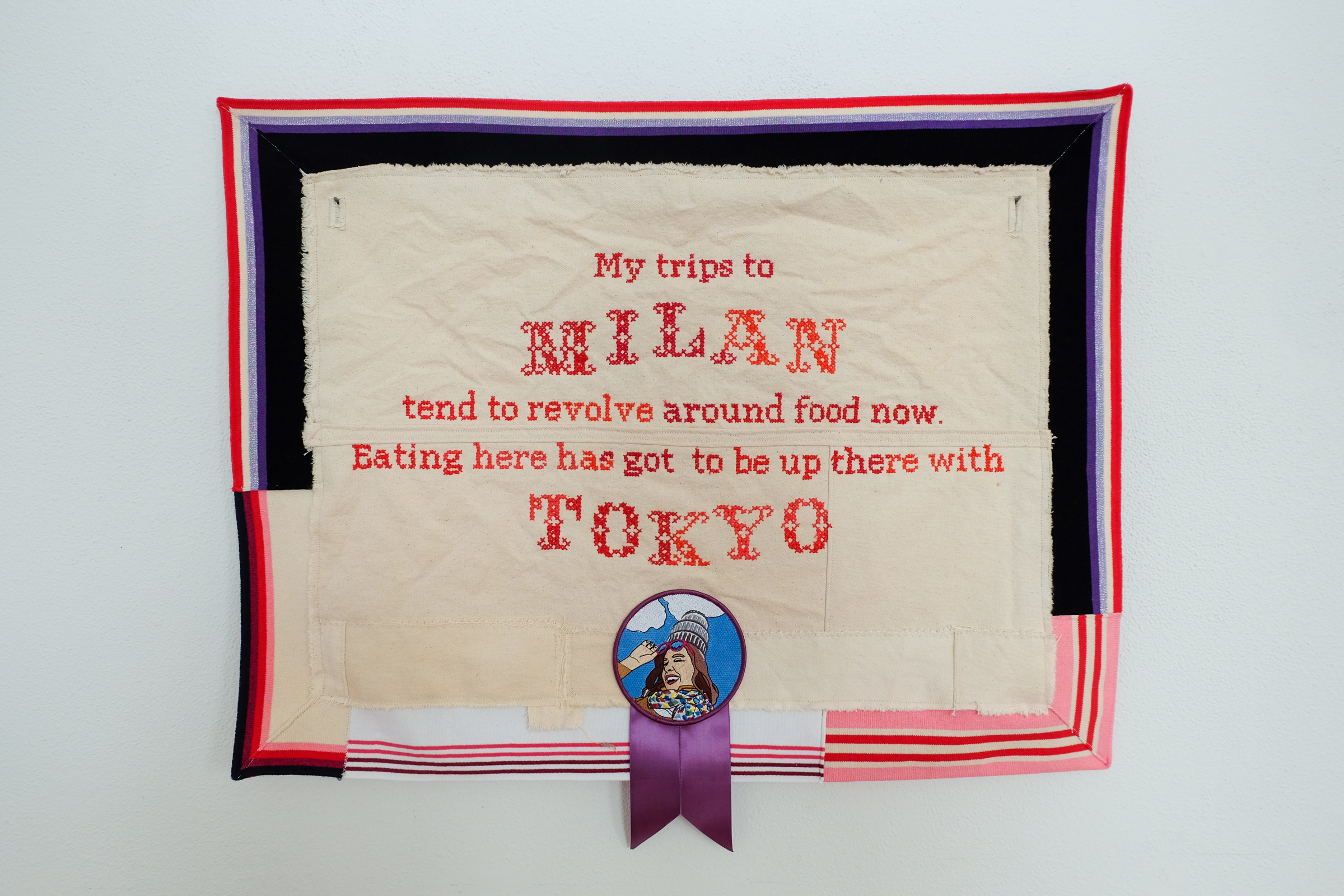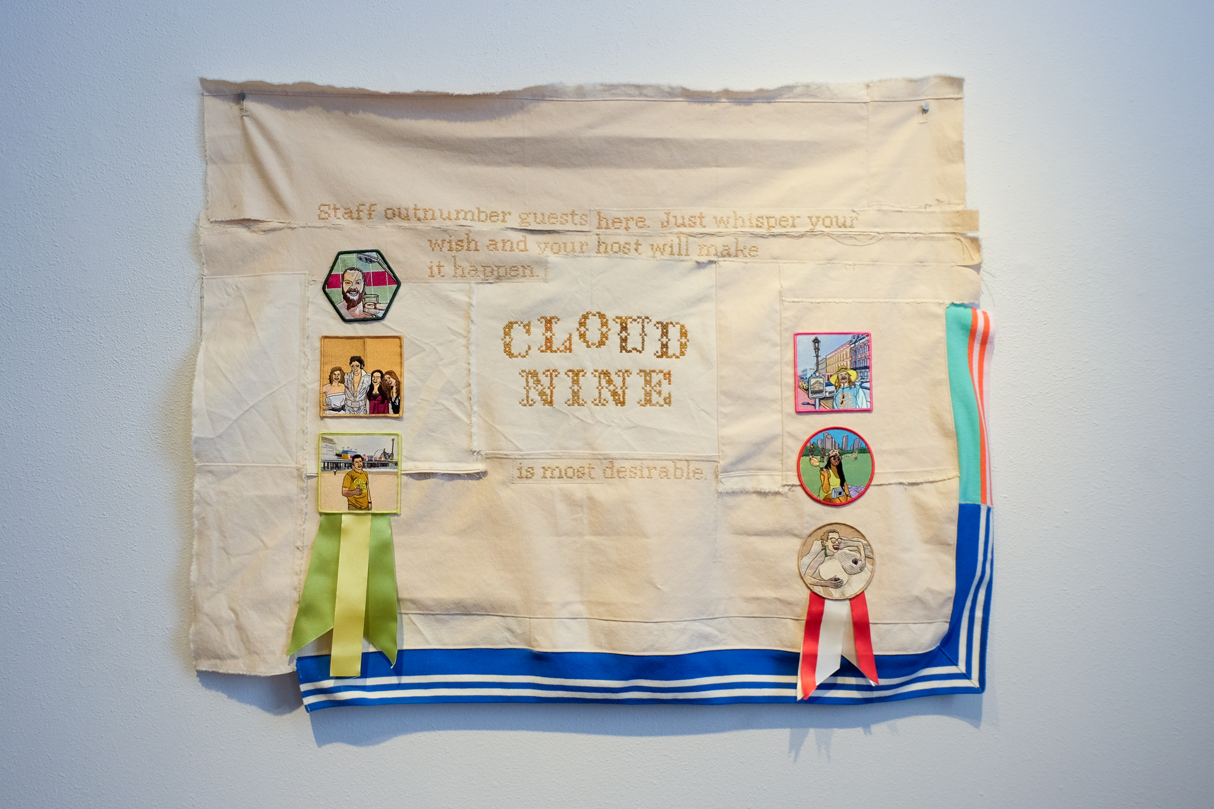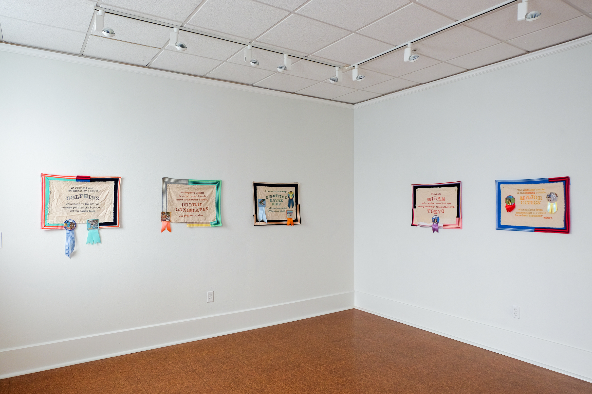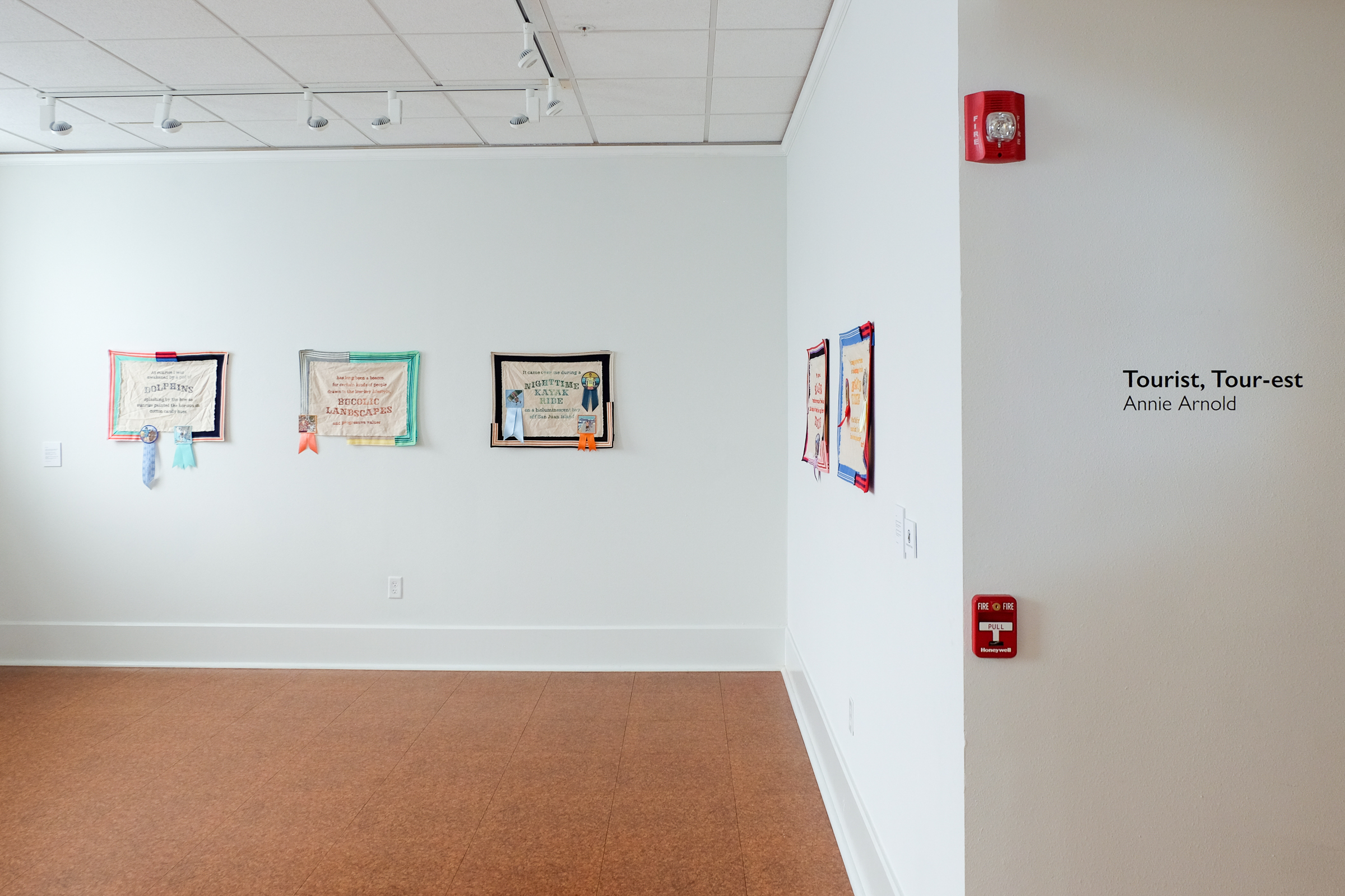 Tourist, Tour-est is a solo exhibition of my new work. It humorously considers how social media and our attention economy have influenced our approach to and documentation of travel. Most of the pieces in this show take the form of diplomas and/or certificates of achievement. I am using this analog method of self-display (hanging one’s degree on the wall) to play with ideas about credentials and accomplishment when it comes to visiting other places. Employing my usual visual language of merit badges, letter jacket references, and embroidered found text, this body of work jokingly highlights the competition and comparison aspects of our conversations about [aspirational] globetrotting.